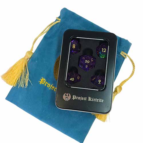 Arriving in a protective metal case and a soft dice bag, this set is a treasure to behold and a perfect gift for the dedicated player or collector in your party. Elevate your game night from the mundane to the magnificent.